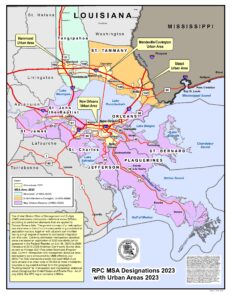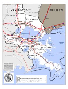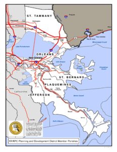 The RPC’s region comprises approximately 4,000 square miles of land and 4,700 square miles of water across eight parishes: Jefferson, Orleans, Plaquemines, St. Charles, St. Bernard, St. John the Baptist, St. Tammany, and Tangipahoa. The combinations of these parishes vary depending upon which designation we are representing.
